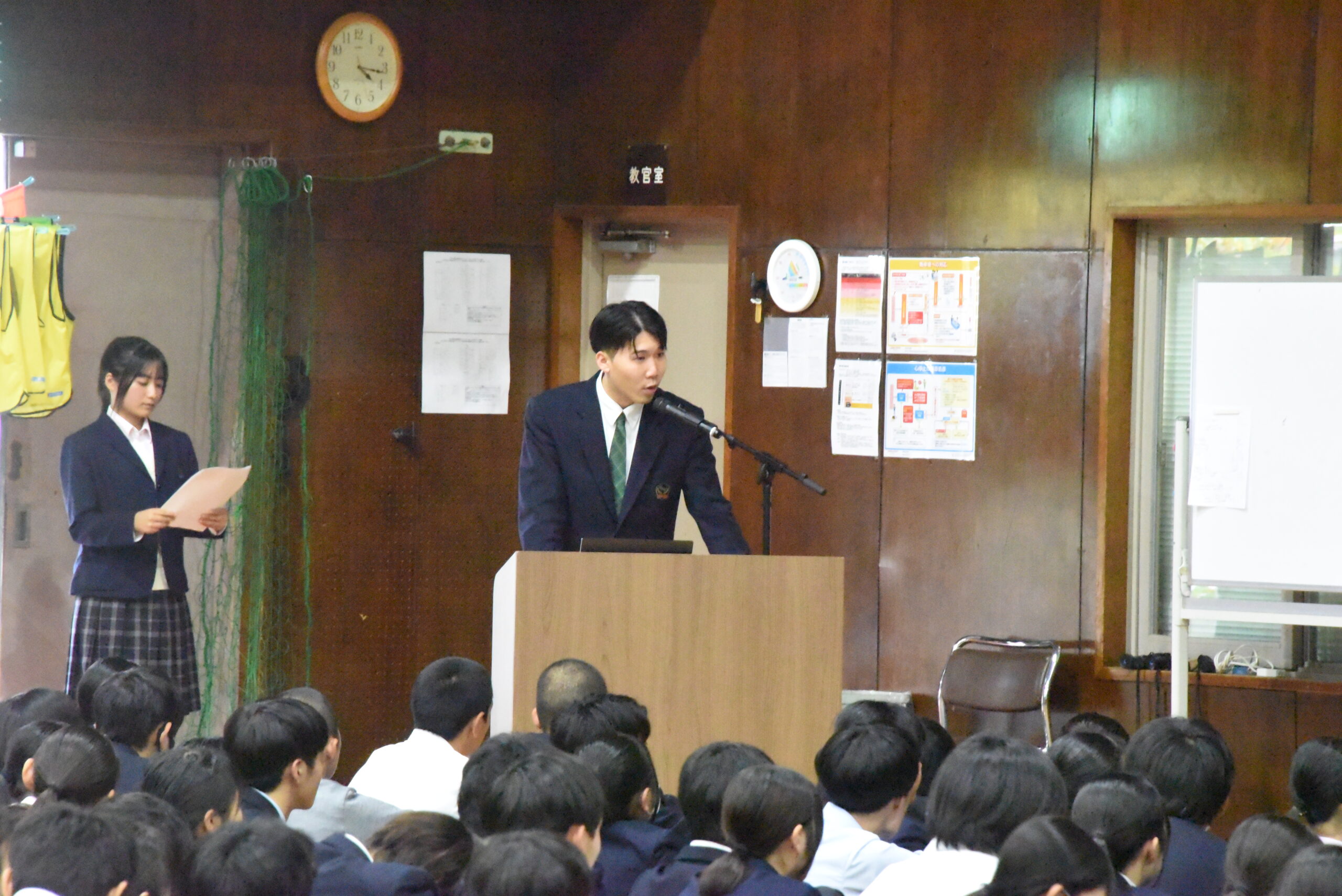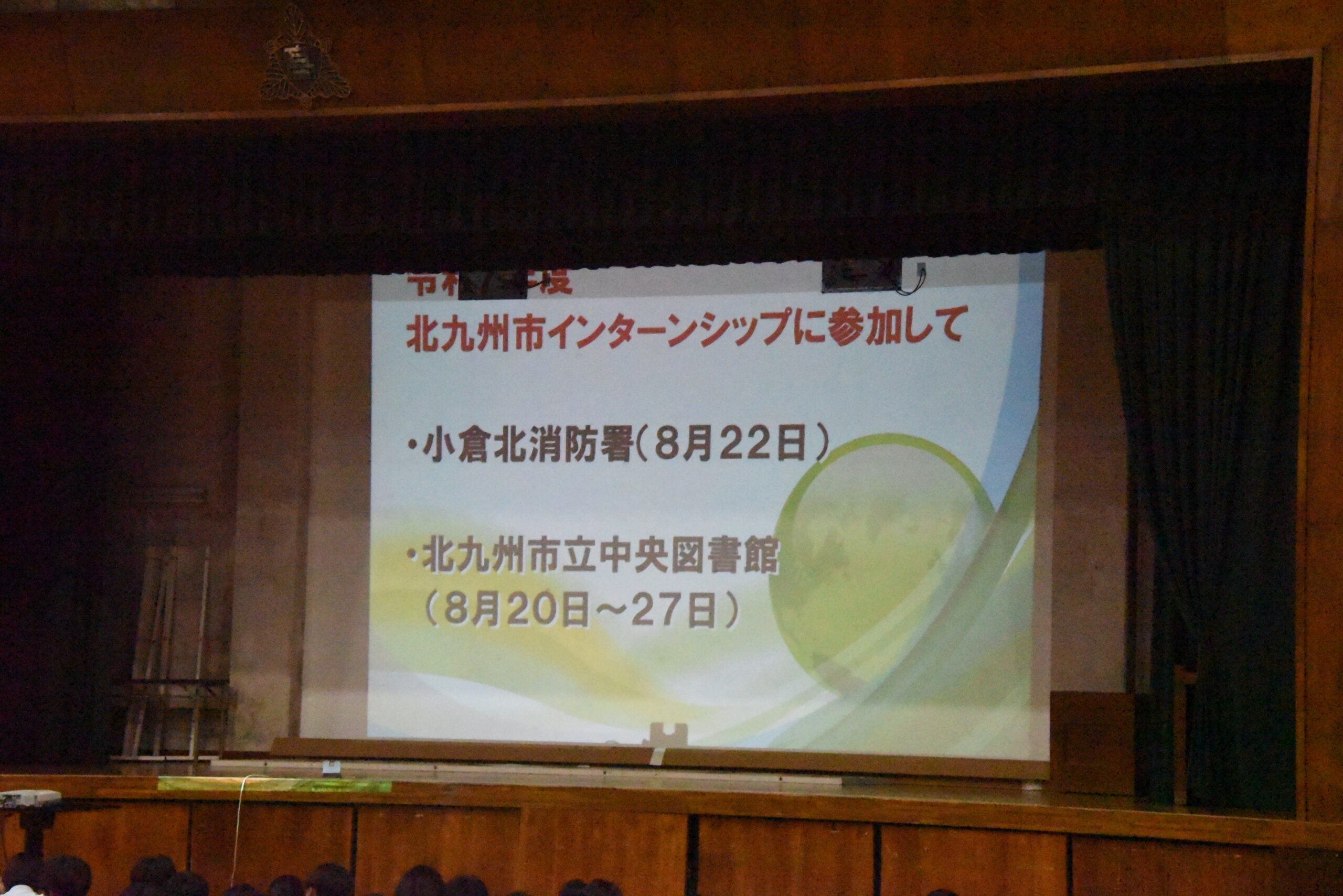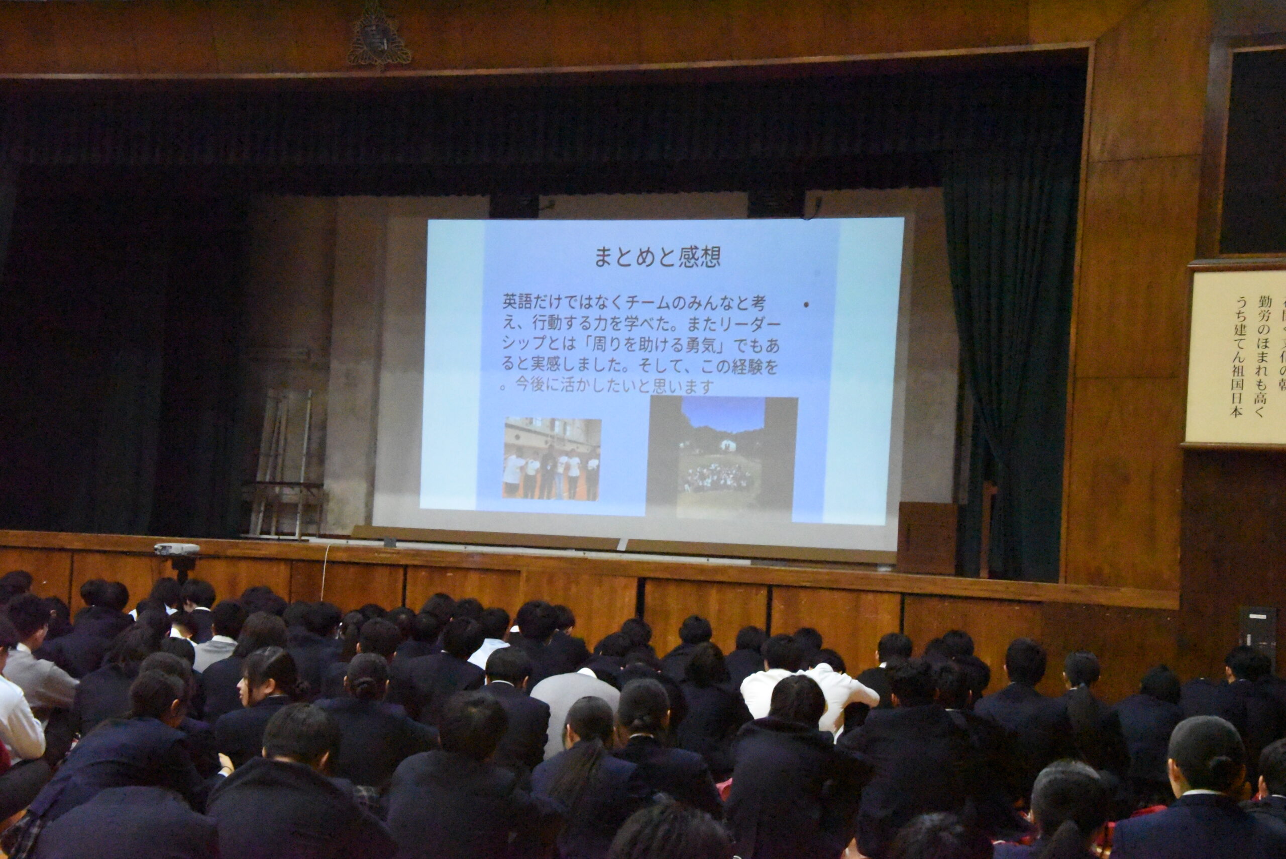 8月の夏休みにさまざまな研修やプログラムに参加した生徒のみなさんが、それぞれの体験を全校生徒に向けて発表しました。