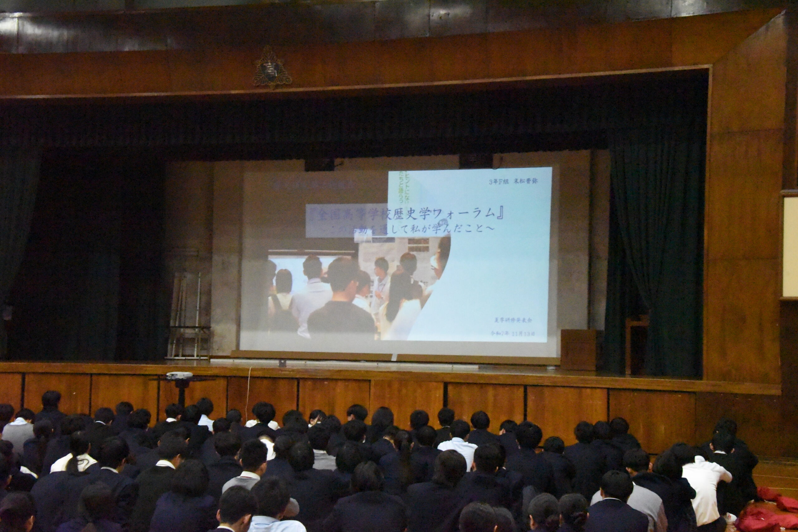 地域の歴史を調査・発表する活動を紹介。自らの足で調べ、まとめ上げた成果を堂々と発表しました。