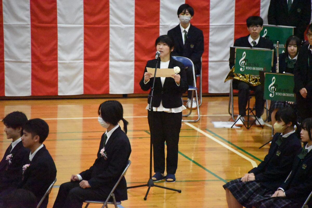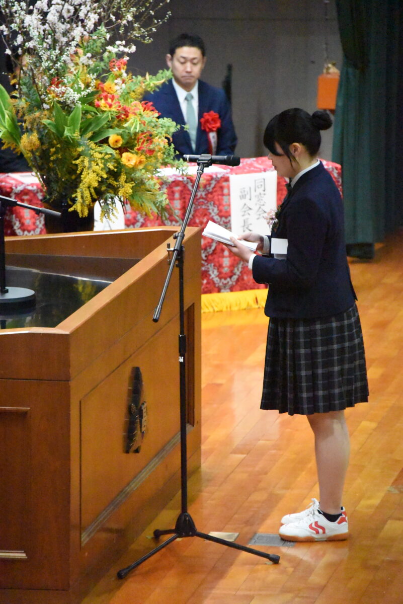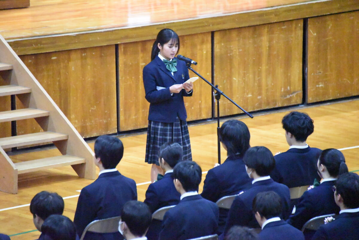 送辞を通して、先輩方に感謝を述べる在校生代表、生徒会長の山内さん
